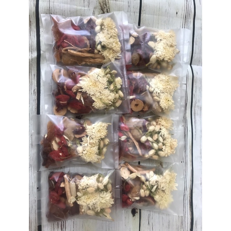 Thành phần : táo đỏ, kỷ tử, long nhãn, nho khô, hoa cúc , hoa nhài , cam thảo, đẳng sâm. Công dụng : Trà bát bảo có vị ngọt, thơm, có tác dụng bổ dưỡng, bổ máu, giải nhiệt, thông tiểu, cầm nôn, tiêu độc, da hồng hào. Cách pha: - Chọn bát uống trà có nắp, hoặc có thể dùng ấm pha chè lớn. - Cho nước ấm vào, lắc bát trà vài vòng, sau đó đổ nước lần thứ nhất đi. - Tiếp đến cho nước sôi 100 độ C vào, đậy nắp, ngâm 15 phút là bạn có thể thưởng thức. - Hoặc nấu nước sôi, cho trà vào nấu trong 10 phút cho ra hết dưỡng chất, để ấm hoặc nguội rồi thưởng thức. - 1 gói trà có thể pha được 1-1.5 lít nước đủ cho cả gia đình cùng uống. - Trà bát bảo có thể uống lạnh vào mùa hè, uống nóng vào mùa đông, nhưng uống đến đâu chêm nước thêm đến đó, không nên pha sẵn trước hay lưu cữu sang ngày hôm sau. Khối lượng : 20 túi HSD: 3 tháng Xuất xứ: Việt Nam #trabatbao, #thongtieu, #tieudoc, #giainhiet, #trangon, #tangcuongsuckhoe