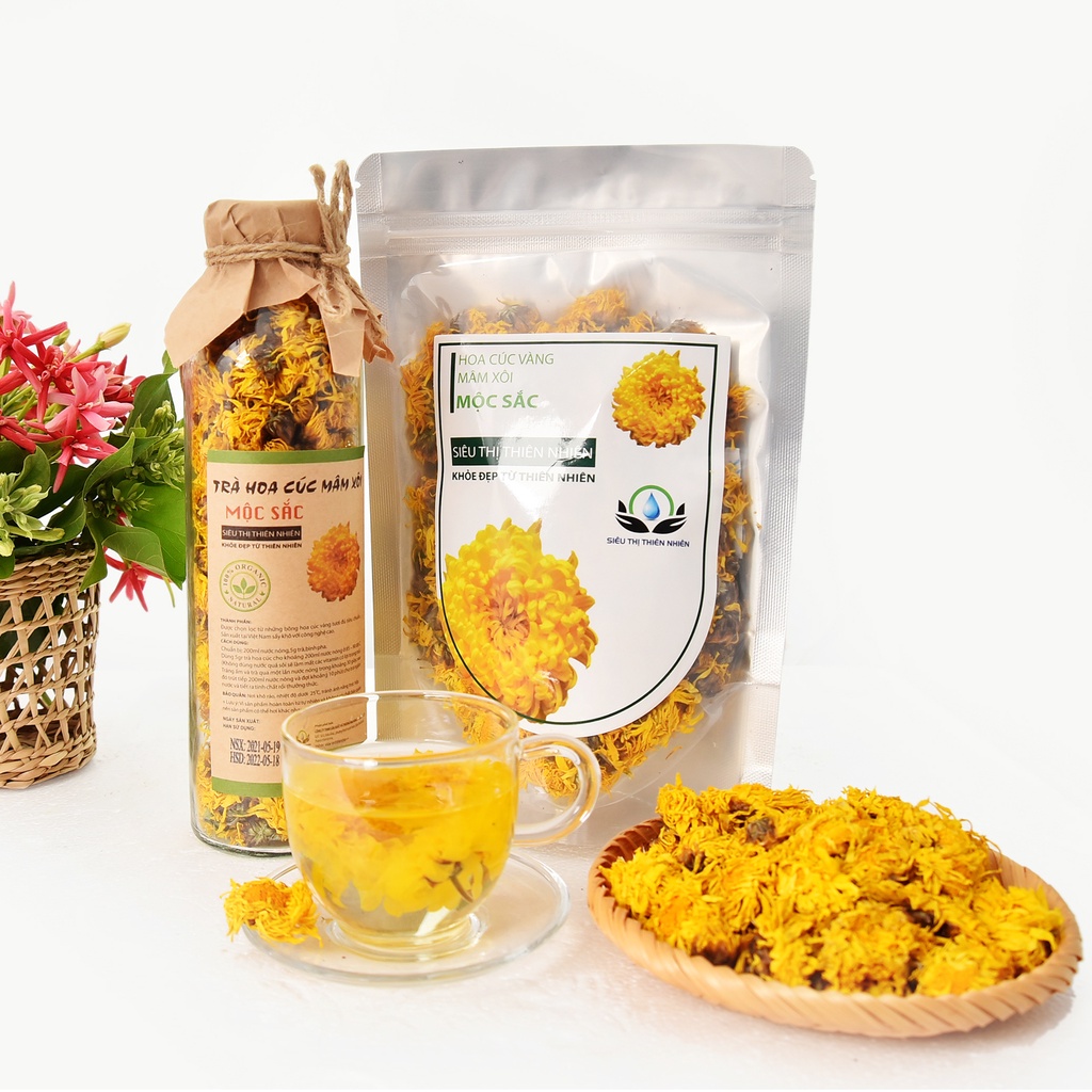 Trà hoa cúc vàng bông(cúc mâm sôi) Mộc Sắc 500g Trà hoa cúc là loại dược liệu quý nhưng không khó tìm với nhiều tác dụng cực tốt cho sức khỏe (đặc biệt là người cao tuổi) như ngăn ngừa huyết áp cao, thanh lọc và thải độc cho cơ thể, đẹp da, sáng mắt……Hãy cùng shop tìm hiểu các công dụng đáng kinh ngạc của trà hoa cúc nhé!
