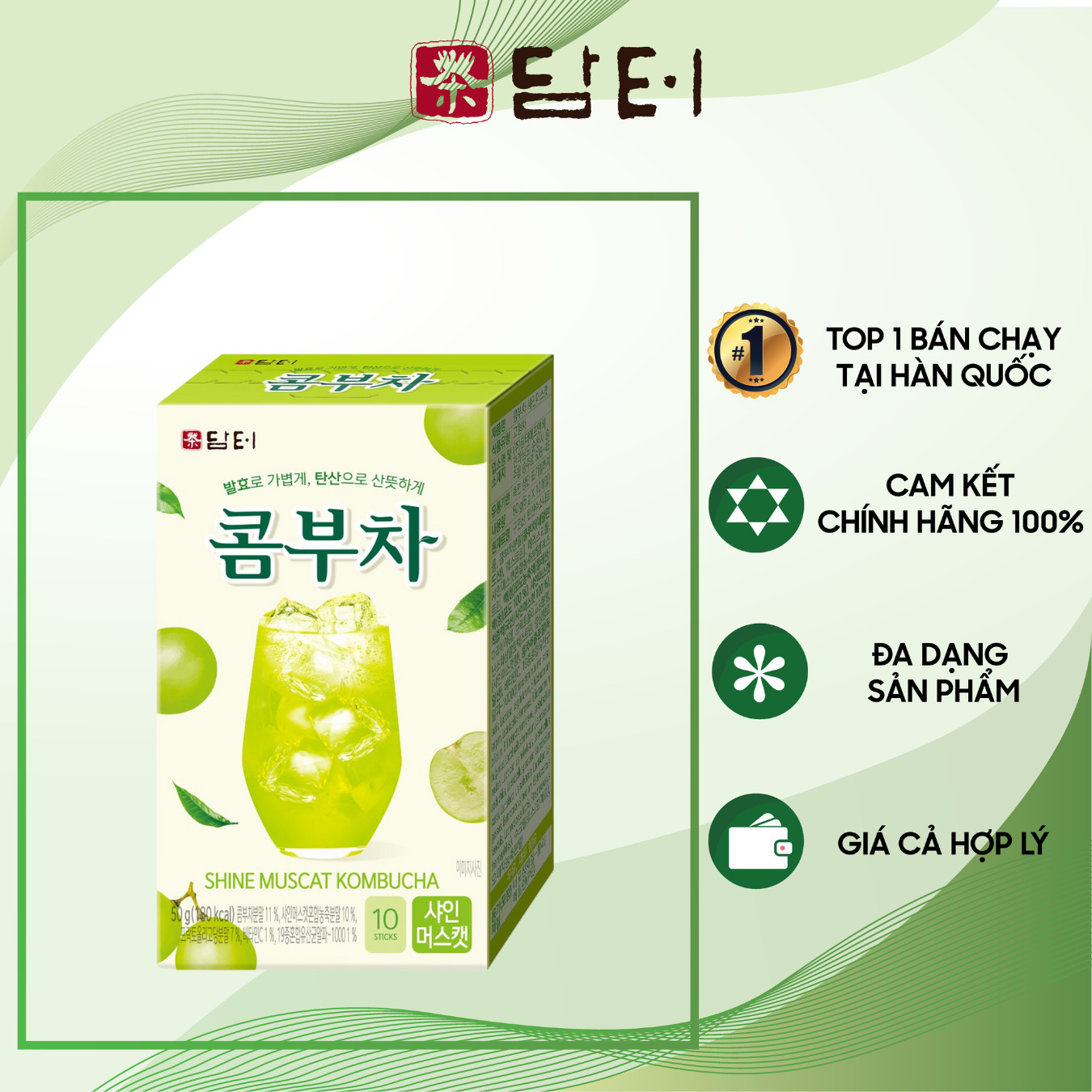 - Trà Kombucha Damtuh được sản xuất từ nguồn nguyên liệu trà đen Hàn Quốc. Đây là lựa chọn phù hợp cho những người đang tìm kiếm một loại nước có gas "healthy": giàu dưỡng chất, ít đường, ít calo. - Sản phẩm gồm 4 hương vị trái cây (nho, chanh, bưởi, xoài) thanh mát, sảng khoái cho bạn lựa chọn. - Sản phẩm dạng gói nhỏ tiện lợi, cách pha chế đơn giản (chỉ cần sử dụng nước lạnh).