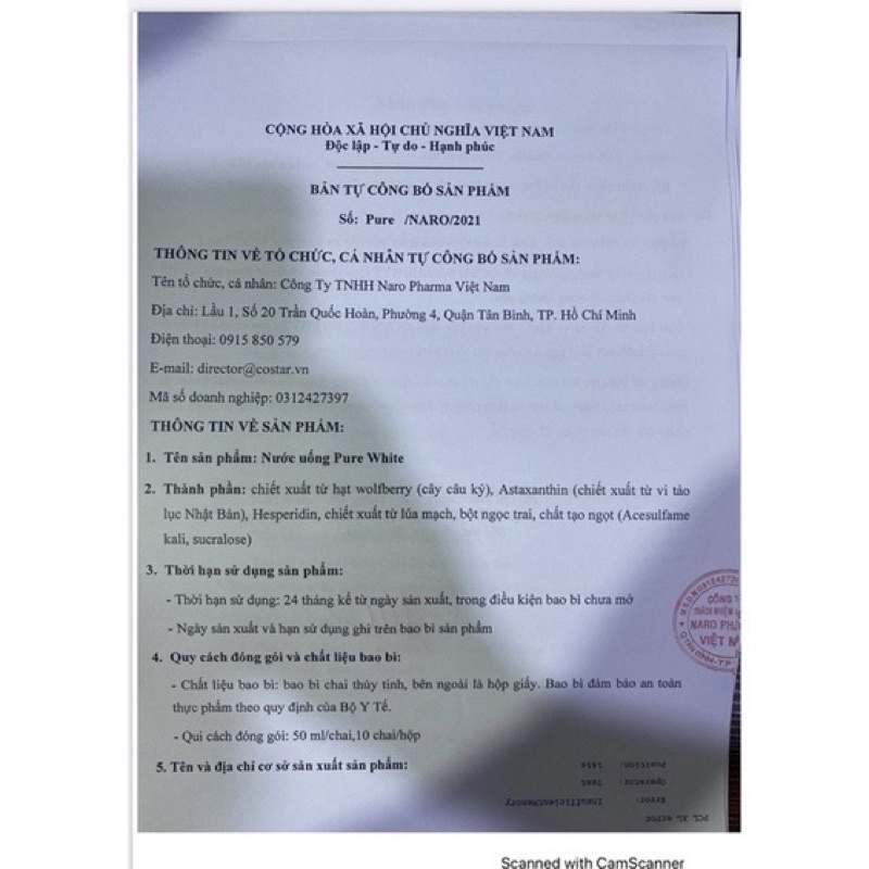 1. CÔNG DỤNG - Nước uống Collagen Pure White hỗ trợ làm trắng da tự nhiên . 2. THÀNH PHẦN: - Chiết xuất wolfberry (kỉ tử): 1500mg (từ 2.550mg trái tươi) - Chiết xuất lúa mạch, ngọc trai: 5mg - Astaxanthin : 3mg - Hesperidin : 30mg - Tocotriennol: 7,5mg - Chiết xuất trái vải: ......50mg - Chiết xuất hoa cúc:..... 5mg - Lượng nhỏ tương đương muối: 0,13g - Năng lượng: ...............9,5kcal - Protein (đạm): ...........0,15g - Chất béo: .................0g - Cacbonhydrat:..........2,8g - Natri: .......................51,5mg - Vitamin C: ...............500mg - Vitamin E: ...............1,8mg
