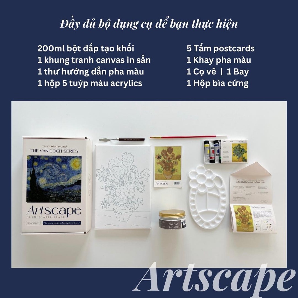 1. Mô tả sản phẩm Bộ tranh đắp nổi Crabit Artscpae - The Van Gogh Series bao gồm: - 200ml bột đắp tạo khối 3D Crabit trắng - 1 khung tranh canvas 20x30cm được in sẵn layout và hướng dẫn vẽ (Starry Night / Vase with Pink Roses / Sunflowers / Van Gogh’s Chair / Irises) - 1 thư hướng dẫn sử dụng và pha màu - 1 hộp 5 tuýp màu acrylics: Black; Cobalt Blue; Lemon Yellow; Deep Red; Sap Green (định lượng 12ml/tuýp) - 5 Tấm postcards trang trí - 1 Khay pha màu - 1 Cọ vẽ - 1 Bay - 1 Hộp bìa cứng