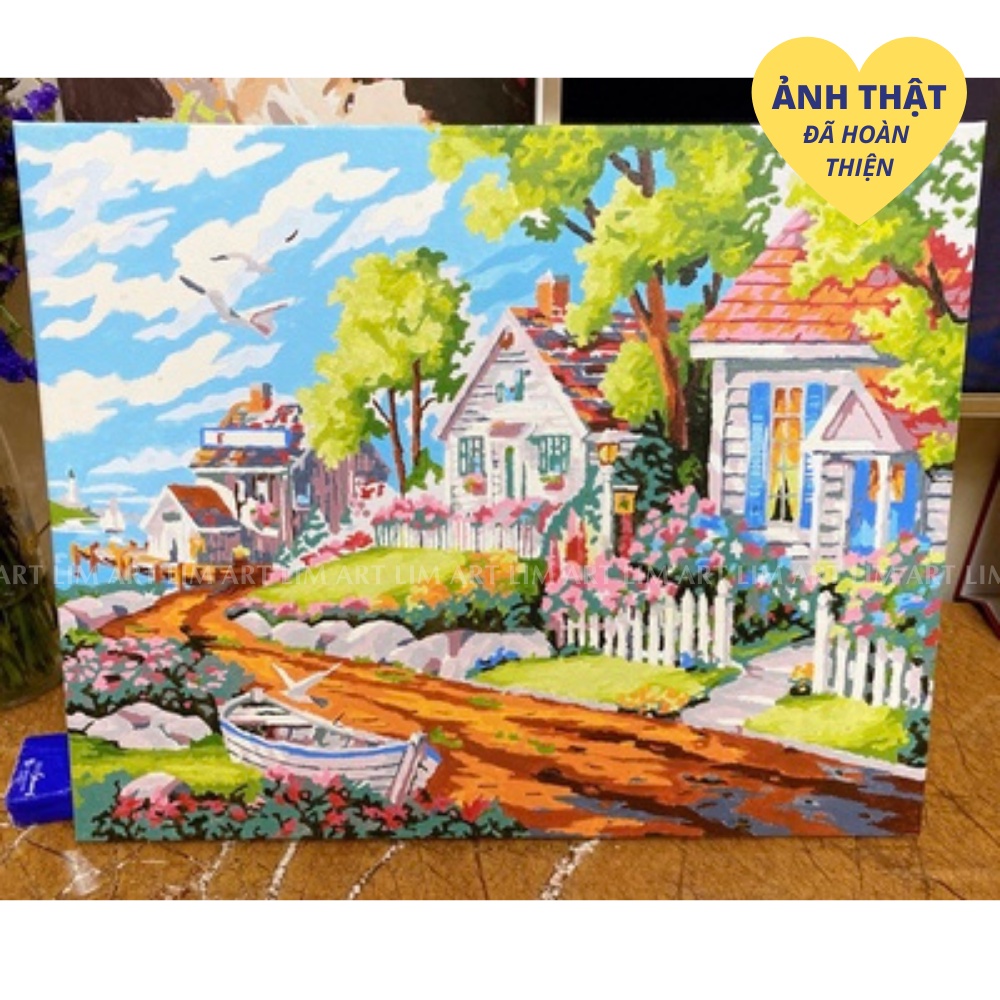 Tranh sơn dầu số hóa tự tô có khung chuẩn màu LIM Art - Tranh tô màu theo số hóa phong cảnh biển- Biệt thự ven biển