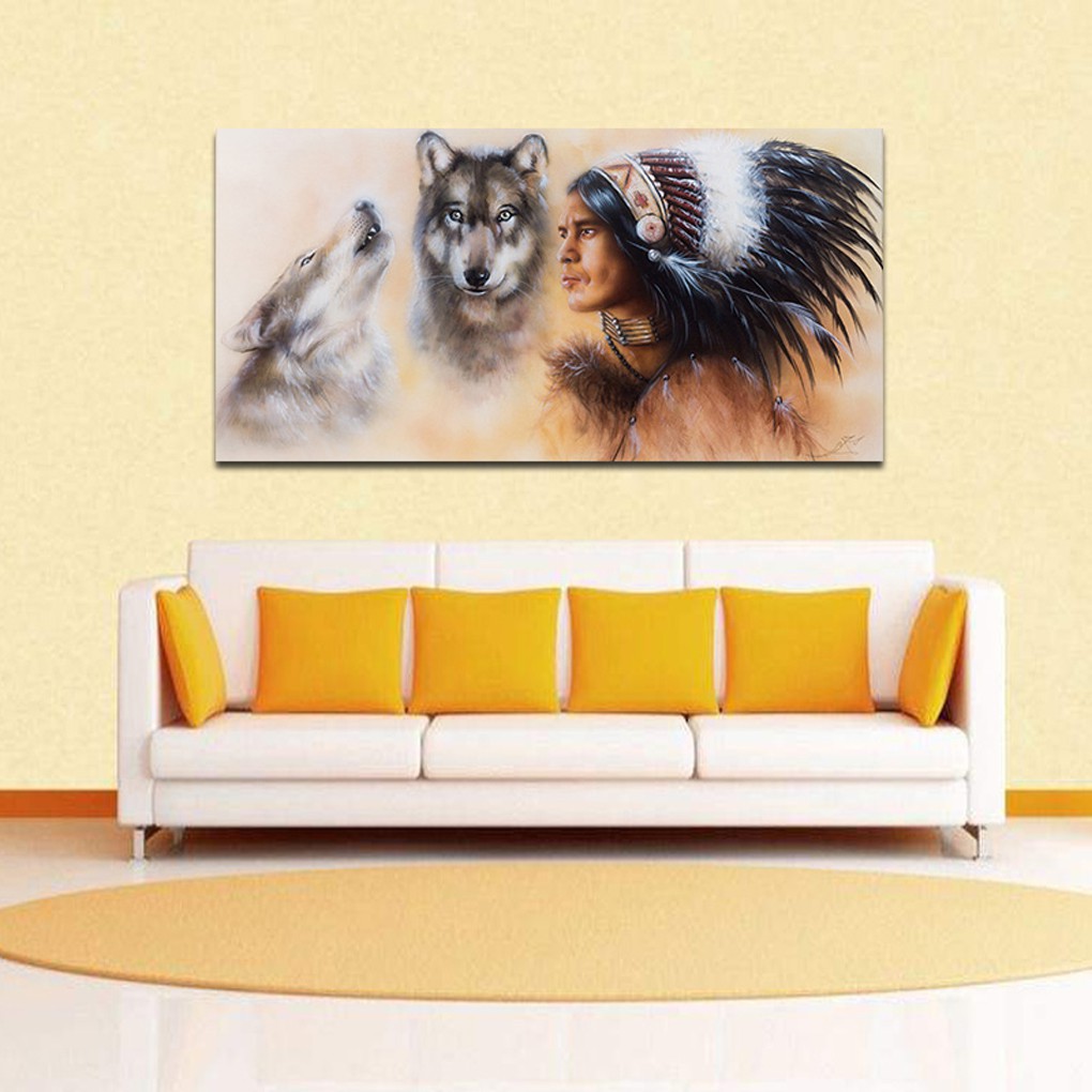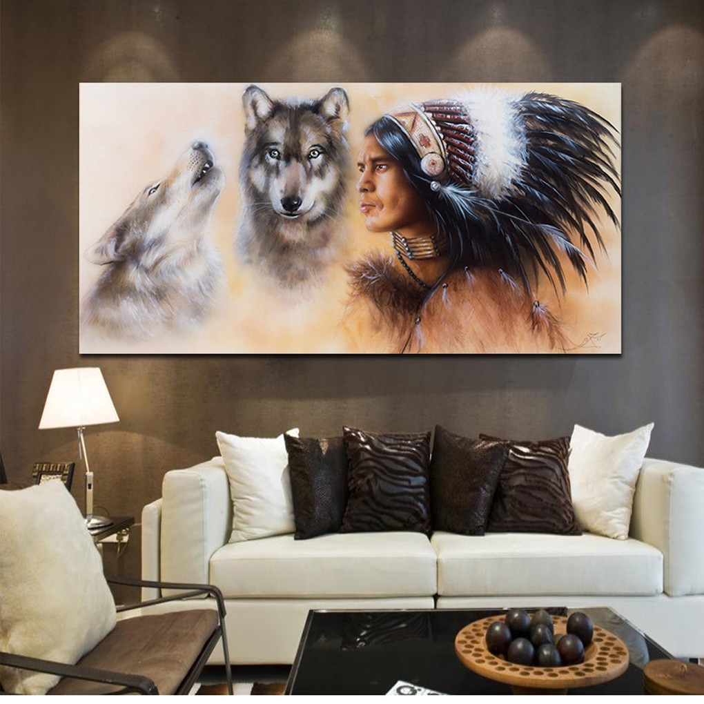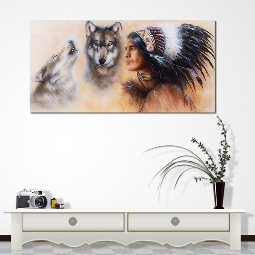 Giới thiệu Tranh sơn dầu treo tường Thổ dân Ấn độ và 2 chó sói