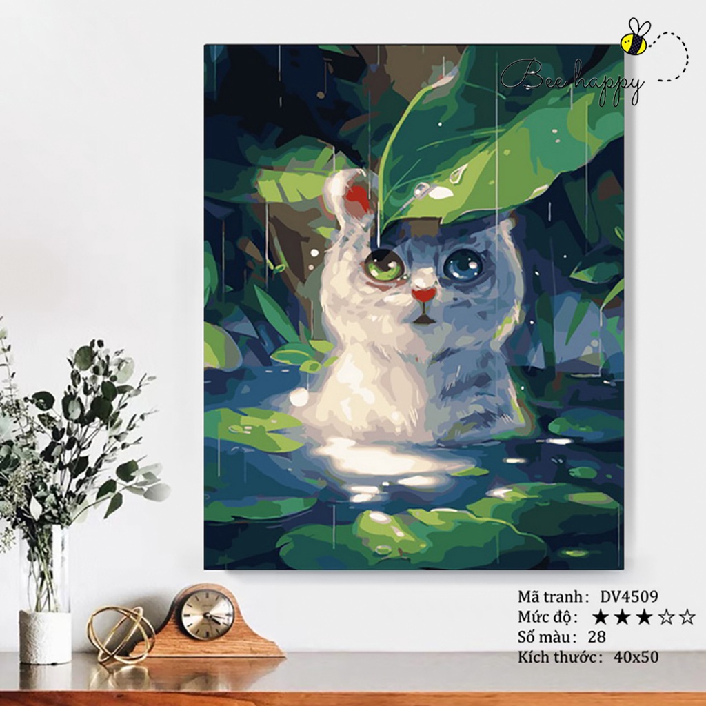 Giới thiệu Tranh tô màu theo số Chú mèo đáng yêu BEE HAPPY cao cấp màu 5ml, 2 bộ cọ có sẵn mã DV4509