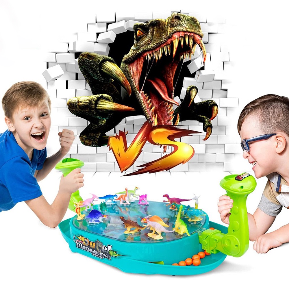 + Trò chơi tương tác gồm 2 cần điều khiển + Chia thành 2 đội mỗi đội 8 khủng long các mầu chủng loại khác nhau + Mỗi Bên 1 Bộ BỊ + Tiến hành gắn các con khung long vào 2 bên trên mặt bàn đồ chơi đã có sẵn + Tiến hành chơi , bên nào bắn được nhiều hơn số lượng khung long của đối phướng đổ hết trước bên đó sẽ chiến thắng