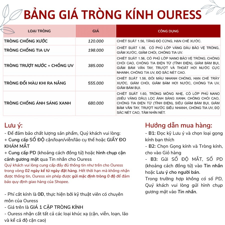 ------------------------------------------------------------------------- LƯU Ý KHI MUA GỌNG + TRÒNG TẠI OURESS 1. Để đảm bảo chất lượng sản phẩm, Quý khách vui lòng cung cấp cho Ouress 2 thông tin quan trọng sau: + Cung cấp SỐ ĐỘ cận/loạn/viễn/lão cụ thể hoặc GIẤY ĐO KHÁM MẮT + Cung cấp PD (khoảng cách đồng tử) hoặc hình chụp cận cảnh gương mặt qua Tin nhắn cho Ouress Lưu ý: Quý khách vui lòng cung cấp đầy đủ thông tin như trên cho Ouress trong vòng 02 ngày kể từ ngày đặt hàng. Hết thời hạn mà không nhận được thông tin, Ouress xin phép được gửi mặc định tròng 0 độ để đảm bảo quy định giao hàng của Shopee. 2. Phí cắt kính là 0Đ, thực hiện bởi kỹ thuật viên có chuyên môn của Ouress 3. Giá tròng phía trên là GIÁ 1 CẶP TRÒNG KÍNH 4. Ouress nhận cắt tất cả các loại khúc xạ (cận, viễn, loạn, lão và kể cả độ cận cao)