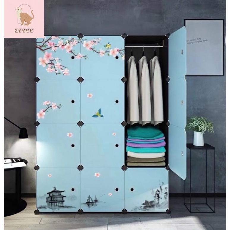 Giới thiệu Tủ nhựa ghép đa năng 12 ô sâu 47, màu đen, cửa xanh trời,decal hoa anh đào - bảo hành 1 năm