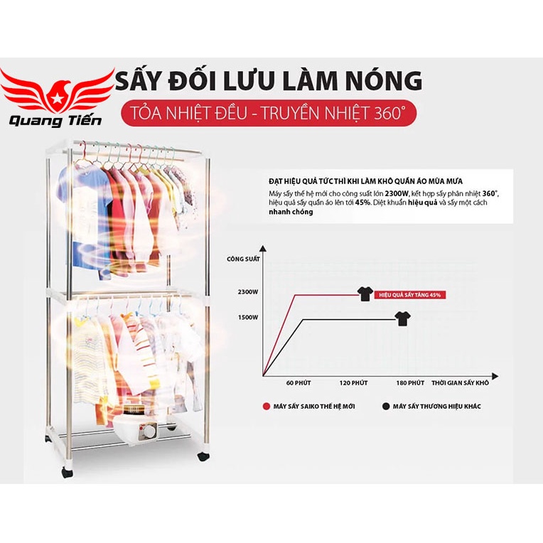 Tủ sấy quần áo Saiko CD-2300 (2300W - 50KG) - Chính hãng Giao hỏa tốc tức thì ✅Thông số kỹ thuật: ✔ Trọng lượng: sấy tối đa 50kg ✔ Hẹn giờ: 180 phút ✔ Chất liệu: Khung (Inox không gỉ), Thanh nối (Nhựa ABS) ✔ Công suất: 2.300W ✔ Kích thước: Chiều cao (190cm) ✔ Xuất xứ thương hiệu: Việt Nam ✔ Sản xuất tại: Trung Quốc ✔ Bảo hành: 18 tháng ✅ Ưu điểm của tủ sấy quần áo Saiko CD-2300 - Tủ sấy quần áo Saiko CD-2300 có thiết kế chắc chắn, tháo lắp đơn giản, bánh xe di chuyển dễ dàng với đa chức năng vừa dùng để sấy quần áo, làm tủ đựng đồ hoặc sưởi phòng. - Với khung quần áo được làm bằng inox không gỉ chịu lực, thanh nối bằng nhựa ABS siêu bền giúp tủ có khả năng chịu được tải trọng tốt. - Tủ sấy quần áo Saiko CD-2300 tích hợp tính năng sấy nóng cho phép diệt sạch vi khuẩn ngăn ngừa nấm mốc cho quần áo ở nhiệt độ cao để bảo vệ sức khỏe gia đình. - Saiko CD-2300 có công suất cao 2300W kết hợp sấy phân nhiệt 360 độ cho hiệu quả sấy quần áo nhanh chóng lên tới 45%. Tủ có chiều cao lên tới 190cm gồm 2 ngăn sấy với hẹn giờ lên tới 180 phút. ✅ Lưu ý: Hình ảnh sản phẩm chỉ có tính chất minh họa, chi tiết sản phẩm, màu sắc có thể thay đổi tùy theo sản phẩm thực tế. ---------------------------------- CHI NHÁNH TẠI HÀ NỘI. - Địa chỉ : số 11 ngõ 279 ngách 279/39 đường Hoàng Mai, quận Hoàng Mai,Hà Nội ( nếu có wifi , 3g tìm trên google map " Cửa hàng thể thao Quang Tiến " . - Điện thoại : 0986.728.135 ; 0988.52.93.93 . - Email : sieuthitienichgiare@gmail.com