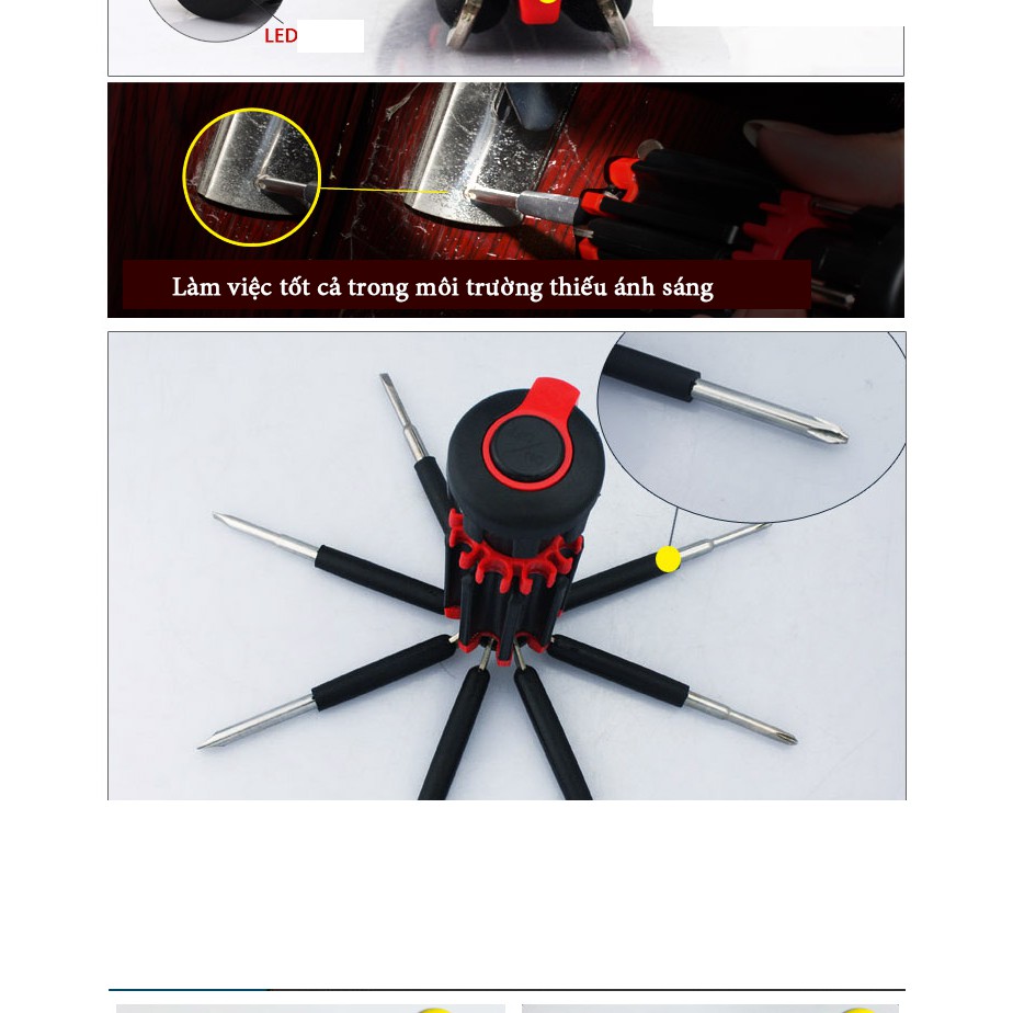 THÔNG TIN SẢN PHẨM : Bộ tua vít vặn ốc vít đa năng 8 trong 1 có đèn led tiện dụng, tích hợp 8 loại đầu vít khác nhau giúp cho thao tác dễ dàng, không mất công đem theo nhiều loại vít khác nhau. Ngoài ra còn có đèn led chiếu sáng khi sử dụng ban đêm. Sử dụng 3 pin AAA cho đèn led (Nếu có nhu cầu). -Phân loại: Multifuntion screwdriver -Kích thước: 13.5 * 3.8cm -Trọng lượng: 200g -Chất liệu: PVC và hợp kim thép -Năng lượng: 3 viên Pin AAA -BỘ SẢN PHẨM BAO GỒM: Tua vít đa năng 8 đầu vít có tích hợp đèn led ( TẶNG KÈM PIN ) Bộ tua vít vặn ốc vít đa năng 8 trong 1 được bao bọc bởi lớp nhựa PVC bên ngoài rất chắc chắn và gọn nhẹ, sản phẩm nhỏ gọn, không chiếm nhiều diện tích không gian. Bạn có thể để gọn trong một góc nào đó để sử dụng mỗi khi cần thiết, đeo bên mình khi đi chuyển hoặc sửa chữa trên cao. -Bộ sản phẩm thích hợp để dùng sửa chữa các đồ điện tử trong gia đình, các loại máy vi tính, laptop, điện thoại di động… đến dùng cho những thợ sửa chữa điện máy. -Bộ vít đa năng tiện dụng, tích hợp 8 loại đầu vít khác nhau giúp cho thao tác dễ dàng, ngoài ra còn có đèn led chiếu sáng khi sử dụng ban đêm. Sử dụng 3 pin AAA. -Chỉ cần bộ ốc vít đa năng 8 trong 1 là có thể thay thế gần như hầu hết các vít thông dụng khác nhau. 8 đầu vít thông dụng nhất được tích hợp trên 1 thiết bị, ngoài ra còn có thêm đồ gài để dễ dàng móc vô thắt lưng, tiện việc mang theo để sửa chữa. -Chất liệu làm bằng hợp kim thép cao cấp, giúp cho đầu vít cứng cáp và an toàn khi sử dụng. CAM KẾT CỦA KHOINGUYENPRO AUTO: Sản phẩm giống như mô tả - Đảm bảo sản phẩm chất lượng, mới 100% - Giao hàng trên toàn quốc – nhận hàng trả tiền QUY ĐỊNH BẢO HÀNH, ĐỔI TRẢ: TRONG VÒNG 48H: - Tất cả các sản phẩm của shop đều được kiểm tra kĩ lưỡng trước khi đến tay người tiêu dùng ,tuy nhiên nếu có bất kì lỗi nào do sản xuất thì quý khách lưu ý quay video lại và thông báo cho shop biết để có phương án đổi trả hoặc bảo hành. - Hỏng hóc, hư ,dập vỡ trong quá trình vận chuyển cũng nằm trong mục bảo hành từ shop bởi vì shop tự tin đóng gói sản phẩm rất kĩ ^^.( nhớ chụp ảnh sản phẩm cùng bao,hộp đóng hàng nhé )..