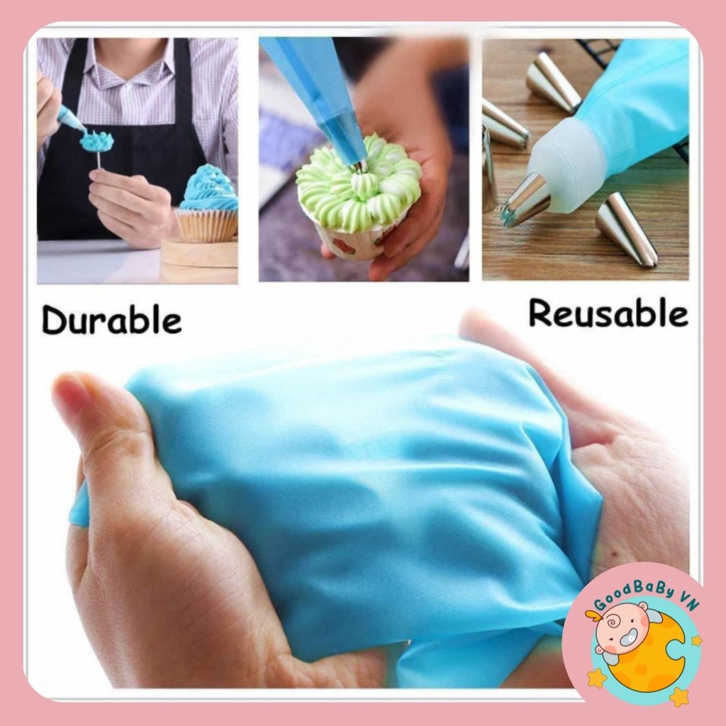 - Bộ trang trí bánh kem: 6 đuôi kem bằng thép không gỉ, 1 túi silicon nướng, 1 đầu ghép nhựa - Bền VỮNG & DỄ DÀNG SỬ DỤNG - Chống ăn mòn, chống dính, không vị, dễ làm sạch Lý tưởng để làm bánh ngọt, bánh quy, bánh quy, sô cô la, bánh táo, v.v. - Thích hợp cho mọi đầu trang trí. - Bên trong êm ái giúp dễ dàng bóp, nhám bên ngoài giúp cầm nắm tốt hơn. #goodbabyvn #andam #lambanh #chobe #tuibatkem #tuibatkemsilicon