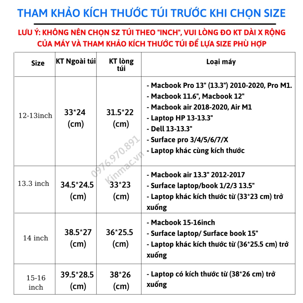 📌 Lưu ý : "inch" là kích thước màn hình. Nên các bạn chọn túi hãy quan tâm tới KÍCH THƯỚC TỔNG THỂ THỰC TẾ của máy chứ không nên chọn theo " (inch) sẽ dẫn đến túi không vừa hay không ưng ý. Ngoài ra Size túi còn phụ thuộc vào độ dày/ mỏng của máy