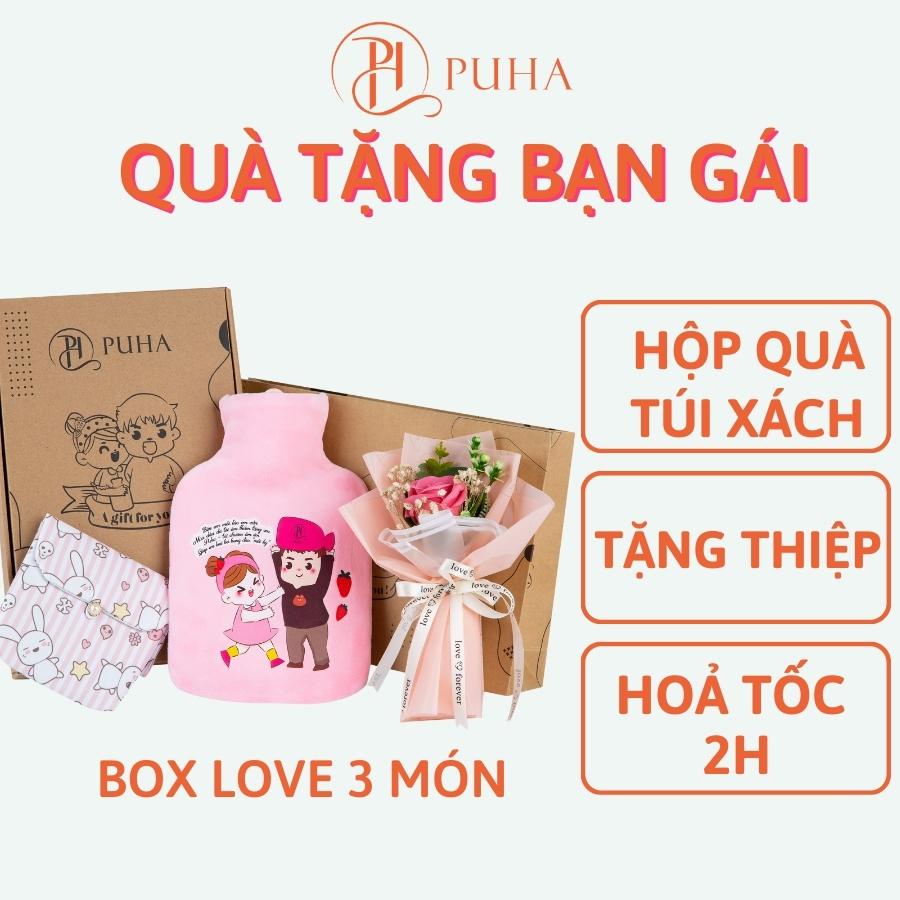 Giới thiệu Túi chườm nóng bụng kinh PUHA 1000ml phiên bản BÊN EM hộp quà tặng bạn gái box love có hoa hồng