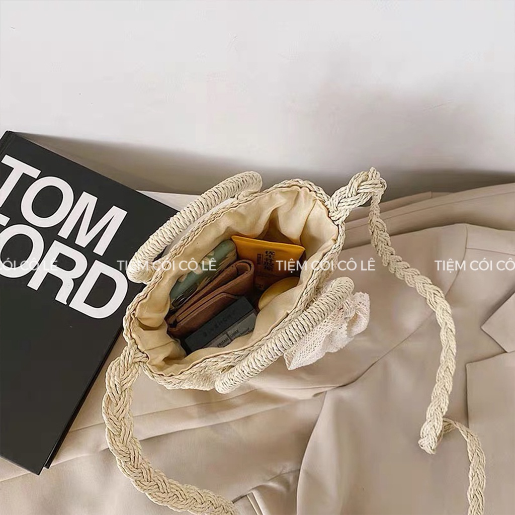 Giới thiệu Túi cói đi biển dáng hộp đính nơ ren phong cách retro - Tiệm Cói Cô Lê