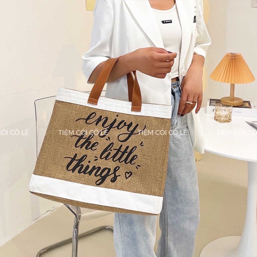 TÚI CÓI ĐI BIỂN ENJOY THE LITTLE THINGS - Chất liệu: Vải bố mỏng - Kích thước: Dài 38cm x Rộng đáy 19cm x Cao 31cm - Phong cách: Trẻ trung, nữ tính - Kiểu dáng: Túi chữ nhật - Ứng dụng: Chụp ảnh, đi biển, du lịch,...