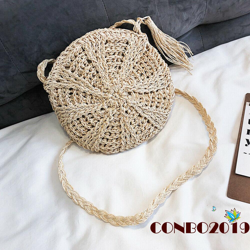 Specification Material: Straw Fabric Color: As the picture shown Application: Beach, messenger bag, storage, etc. Size: Diameter: 22 cm(approx.) Strap Length:110cm(approx.)
