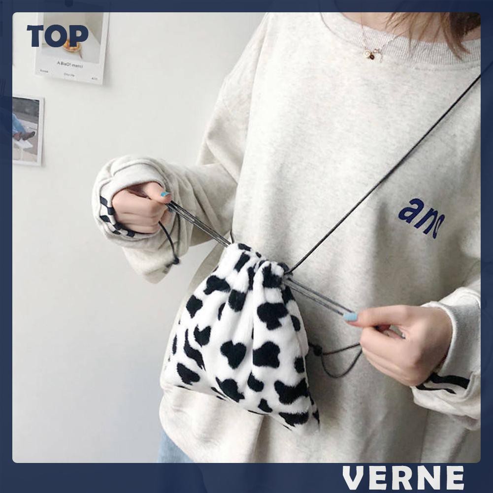 Fashion Cow Milk Printed Plush Crossbody Bags for Women Girl Drawstring Shoulder Messenger Mini Small Money Pouch Handbags Feature: Cow milk pattern,drawstring design. Plush material, soft, small, stylish.