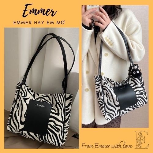 Giới thiệu Túi đeo vai họa tiết ngựa vằn, túi vải dạ ép phối da siêu xinh quai dài, phụ kiện Emmer