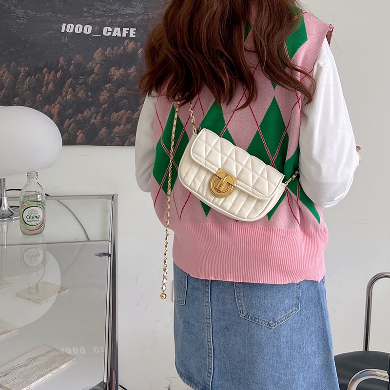 Chất liệu: PU Họa tiết: Màu trơn Cách mở: Mở khóa Kiểu túi: Túi đeo một bên vai Phong cách: Túi đeo vai kẻ sọc hình thoi chuỗi mắt xích Phong cách: Đường phố thời thượng Dịp sử dụng: Hàng ngày Số gốc dây: Gốc đơn Chiều dài dây đeo vai: 120cm (Có thể điều chỉnh) Độ cứng: Trung bình