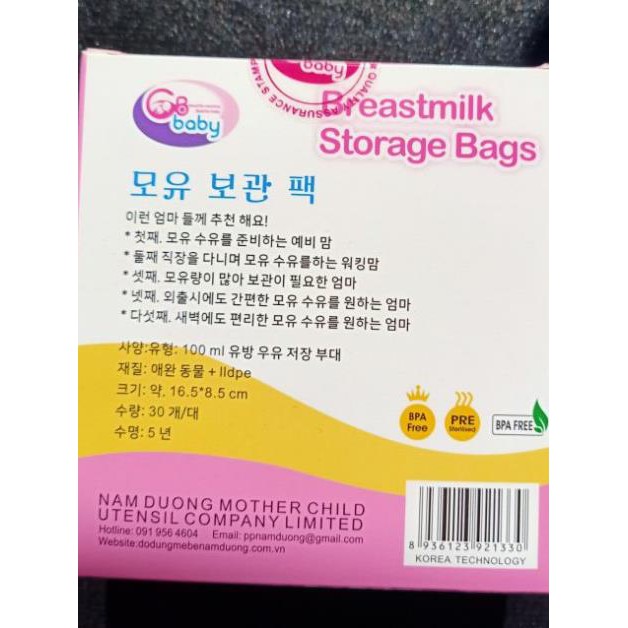 Túi trữ sữa Gb baby Mã sản phẩm : TTS Thương hiệu : gb baby Túi trữ sữa Gb baby 100ml được làm từ chất liệu Free BPA (không có chứa BPA- chất gây ung thư cho trẻ), rất an toàn cho bé - Túi trữ sữa đã được tiệt trùng sẵn do đó sữa sẽ không bị ảnh hưởng bởi môi trường bên ngoài giảm tối đa các hiện tượng oxy hóa gây mất chất. Thiết kế: - Túi trữ sữa Gb baby 100ml 50pcs rất chắc chắn, an toàn - Dễ dàng khóa với 3 lần khóa zipper ở miệng túi - Không rò rỉ, không chảy sữa - Có thể hút sữa trực tiếp vào túi (không cần bình). - Túi trữ sữa Gb baby 100ml có thể tự đứng vững, dễ dàng khi bảo quản trong tủ lạnh. - Chữ in giữa lớp túi trong và lớp túi ngoài nên rất an toàn cho bé, không thể bị xóa - Dễ dàng sử dụng - An toàn với tủ lạnh, tủ đông - Túi đựng sữa mẹ (trữ sữa mẹ) gọn gàng, xếp đứng trong tủ lạnh, tủ đông dễ dàng. - Đựng được 100ml - Quy cách đóng gói: 30 túi/hộp