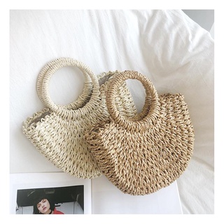 Túi cói rơm Vintage - quai tròn xách tay - hình bán nguyệt cỡ lớn - đan kiểu lưới thưa