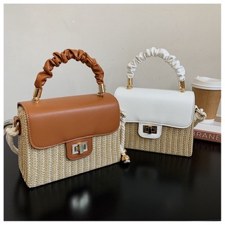 Túi cói phối da đeo chéo - hình hộp chữ nhật - nắp da khóa gập