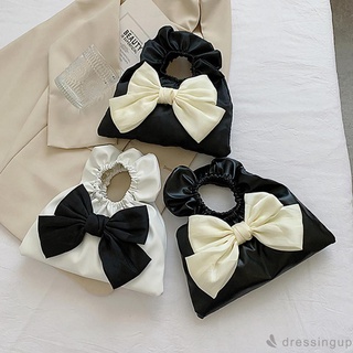 DRE-Women Elastic Rubber Band Handbag, Ruched Tote Bag with Bow Knot Decor, White/ Black