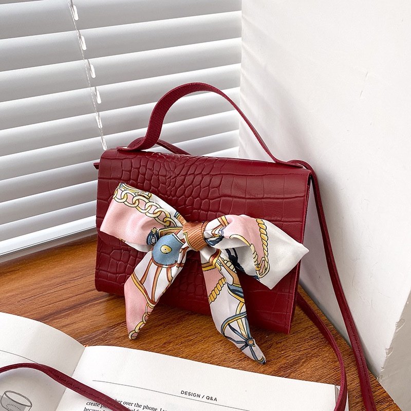 Giới thiệu Túi Xách Đeo Vai Hình Vuông Cỡ Nhỏ Vân Da Cá Sấu Phối Khăn Lụa Cá Tính