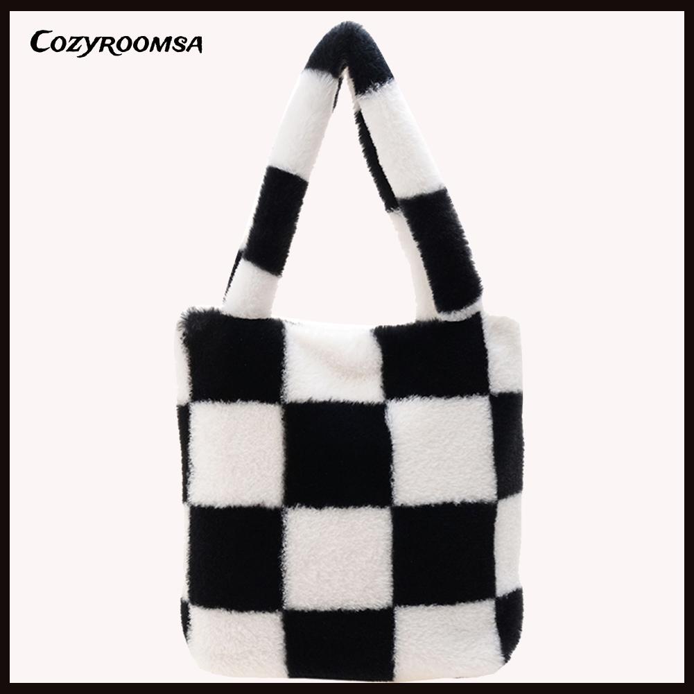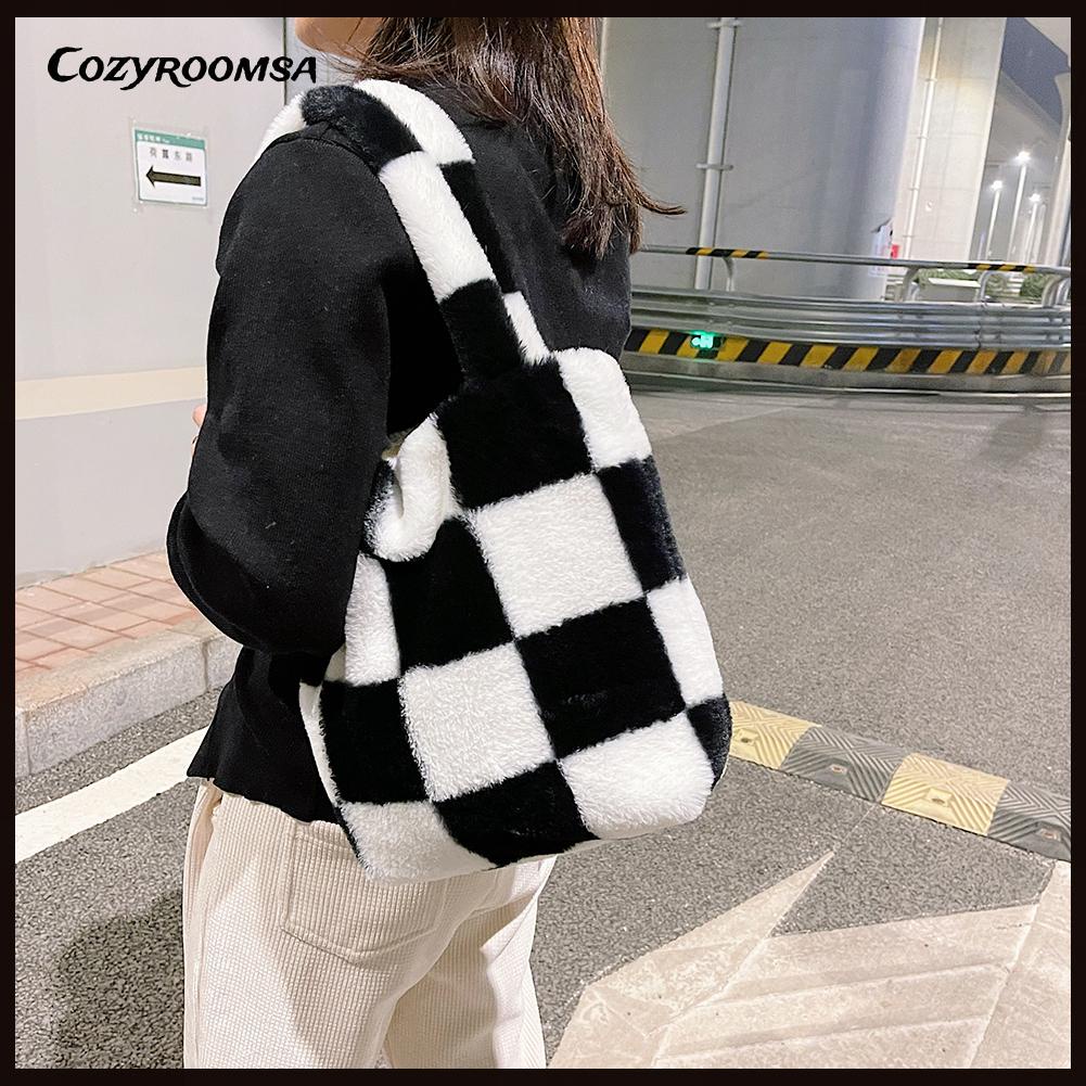 Giới thiệu Túi xách đeo vai vải lông in họa tiết sọc ca rô thời trang thu đông dành cho nữ