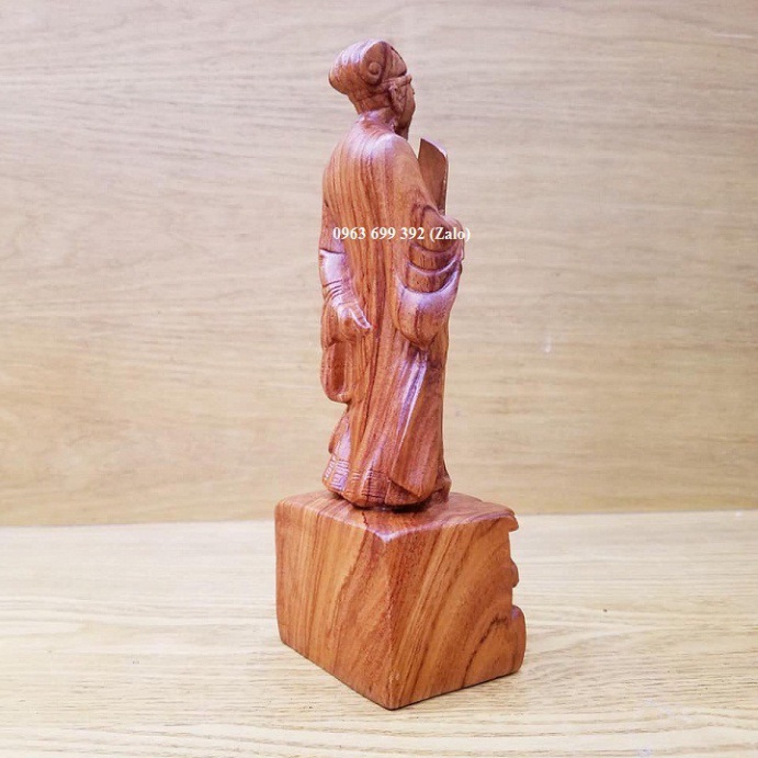 Thông tin sản phẩm: Tượng khổng minh Kích thước: cao 20 ngang 7 sâu 5.5 cm Chất liệu: Gỗ hương nguyên khối --------------------------------------------- Ý nghĩa sản phẩm: - Trong dân gian, Khổng Minh vẫn luôn được xem là vị thánh tượng trưng cho trí tuệ, sự thông minh, uyên bác và tài thao lược lãnh đạo kiệt xuất. Bài trí tượng Khổng Minh do đó sẽ mang lại sự thông minh uyên bác, có lợi cho đường công danh sự nghiệp, học hành thi cử đỗ đạt cao,… Chính vì thế mà tượng Khổng Minh rất được ưa chuộng và thích hợp cho các bậc lãnh đạo, cố vấn, các chuyên gia, hoặc các học giả và lớp dân trí thức. - Thứ nhất, Khổng Minh là người có học thức uyên thâm, trí tuệ siêu phàm, vì thế, bài trí hoặc thờ phụng tượng Khổng Minh sẽ giúp tăng cường hiểu biết, mở mang trí tuệ đầu óc, học hành thi cử đỗ đạt cao, cùng với nhiều suy nghĩ sắc sảo và ý tưởng sáng tạo. Ngoài ra, việc bài trí tượng Khổng Minh còn mang ý nghĩa thể hiện đẳng cấp cá nhân, tầm ảnh hưởng xã hội của người sở hữu. - Thứ hai, như đã nhắc đến trong phần tiểu sử, Khổng Minh là người vô cùng tinh thông phong thủy, bát quái và tướng pháp, do đó nên bài trí tượng Khổng Minh sẽ có tác dụng tốt trong việc trừ đuổi tà ma. - Tượng Khổng Minh được làm bằng rất nhiều các chất liệu khác nhau như đồng, vàng, gốm sứ tráng men, nhưng phổ biến và được ưa chuộng hơn cả là tượng Khổng Minh làm từ các loài gỗ quý như gỗ hương, gỗ trắc, gỗ sưa, gỗ hoàng đàn, bách xanh… Những chất liệu này không chỉ làm tôn thêm giá trị thẩm mĩ, sự cao quý cho bức tượng, mà còn có lợi cho sức khỏe người sở hữu. - Bài trí tượng Khổng Minh trong nhà hay tại nơi làm việc đều rất tốt cho phong thủy. Tuy nhiên không phải ai cũng biết cách bài trí tượng gỗ Gia Cát Lượng sao cho hợp phong thủy nhất. Bởi chỉ khi bài trí đúng nơi đúng cách thì tượng gỗ mới phát huy hết công năng của nó. Vì vậy khi đã chọn mua được một bức tượng Khổng Minh rồi hoặc đang có ý định mua thì quý khách cũng cần chú ý những điểm quan trong sau: - Khi bài trí cần phải chú ý không để tượng ở những nơi tăm tối, ẩm thấp. Cần phải chọn những nơi thích hợp như trong phòng khách, phòng làm việc hoặc không gian trưng bày riêng. - Người đang đi học hoặc đã đi làm nên đặt trên bàn làm việc hoặc cạnh bàn làm việc sẽ trợ giúp tốt cho công việc, đưa ra những quyết định đúng đắn. --------------------------------------------------- Thông tin liên hệ: Đồ gỗ mỹ nghệ Bảo Giang Đ/c: Số nhà 2, ngõ 22, Tân Xuân, Xuân Đỉnh, Bắc Từ Liêm, Hà Nội Hotline: 0989899551 (Zalo)