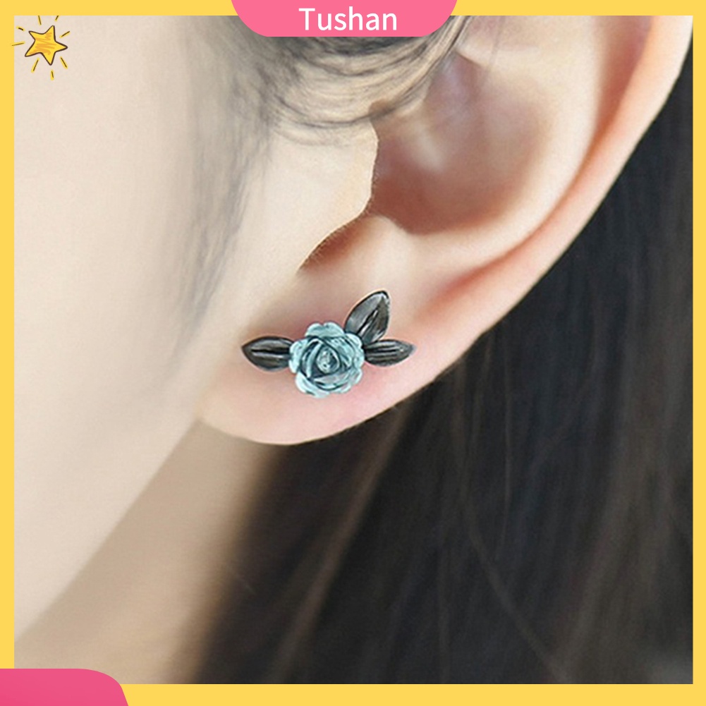Giới thiệu TUSH_Fashion Women Asymmetric Thorns Branch Rose Flower Ear Stud Earrings Jewelry
