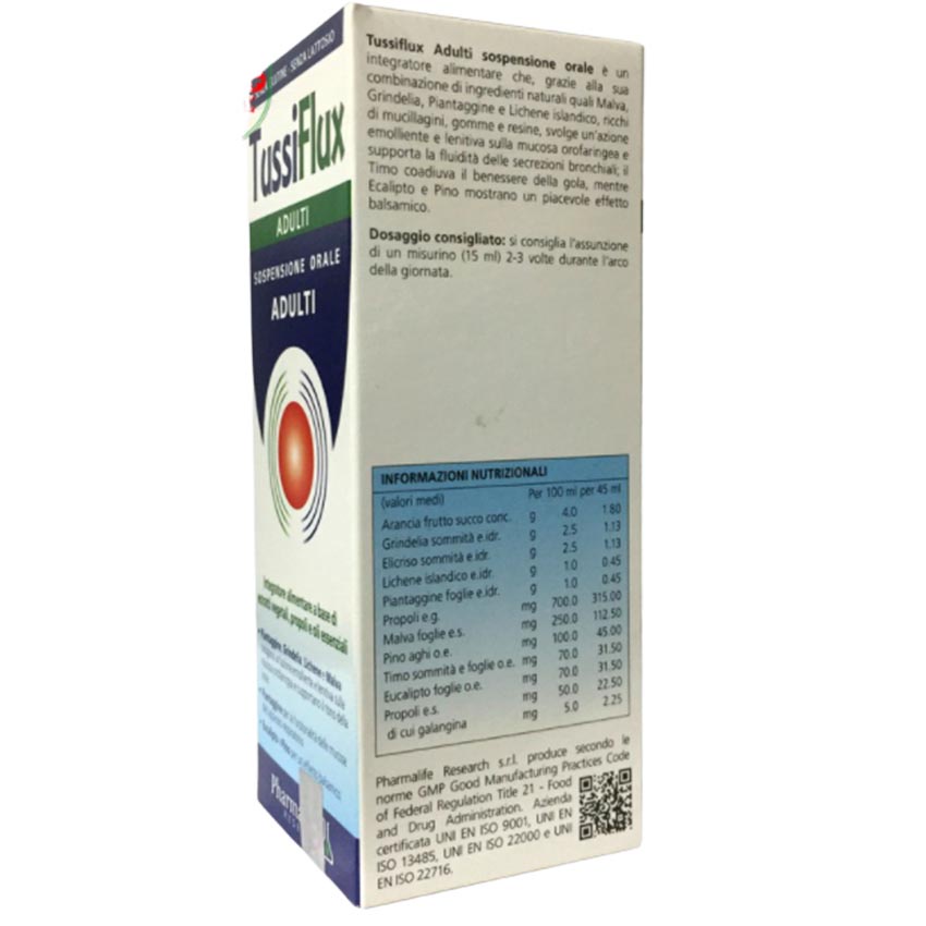 Thành Phần TussiFlux Adult: Thành phần cho 100ml: Dịch chiết hydroglycerin hoa Grindelia (Grindelia robusta):................2,5g Dịch chiết hydroglycerin ngọn Cúc bất tử (Helichrysum italicum):......2,5g Dịch chiết hydroglycerin Địa y Iceland (Cetraria islandica):...................1g Dịch chiết hydroglycerin lá mã đề (Plantago major):..............................1g Dịch chiết glycerin keo ong (Propolis):............................................700mg Chiết xuất khô lá cây cẩm quỳ (Malva sylvestris):...........................250mg Tinh dầu lá thông (Pinus sylvestris):................................................100mg Tinh dầu cỏ xạ hương (Thymus vulgaris):.........................................70mg Tinh dầu lá khuynh diệp (Eucalyptus globulus):.................................70mg Chiết xuất khô keo ong (Propolis) định chuẩn 10% galangin:.............50mg Phụ liệu: nước khử khoáng, fructose, mật ong hoa dại, nước ép cam cô đặc (Citrus aurantium) 4g, chất bảo quản (Kali sorbat E202), chất điều chỉnh độ acid (acid citric E330), chất ổn định (gôm xanthan E415). Không chứa lactose, Không chứa Gluten