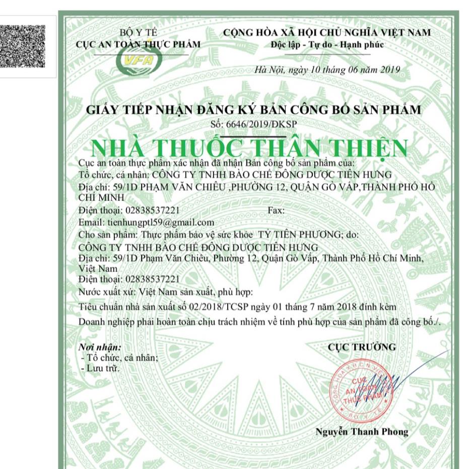 · Thông tin mô tả sản phẩm là hoàn toàn chính xác với công bố sản phẩm đã đăng ký với Bộ Y tế, 100% sản phẩm đều có giấy phép lưu hành từ Bộ y tế · Cam kết tất cả các sản phẩm cung cấp cho Quý khách hàng đều mới 100%, có nhãn hiệu và xuất xứ rõ ràng. _x000D_ Tỷ Tiên Phương giúp hỗ trợ điều trị cho các trường hợp bị nghẹt mũi, sổ mũi và hắt hơi liên tục khi thay đổi thời tiết. Sản phẩm đạt hàng Việt Nam chất lượng cao.