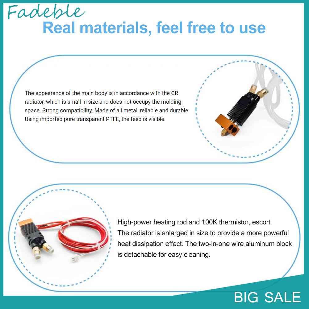 Mk8 Đầu phun 0,4mm 2 trong 1 ra mắt Máy in nóng hai màu trong suốt Ống nhiệt PTFE Bộ thanh sưởi 3D Bộ phận máy in 3D cho Creality Ender-3 / CR-10 Đặc điểm: Kích thước bên ngoài của thân chính phù hợp với bộ tản nhiệt CR, âm lượng nhỏ và không chiếm không gian đúc. Khả năng tương thích mạnh mẽ. Được làm bằng tất cả các kim loại, đáng tin cậy và bền. Ống PTFE trong suốt nguyên chất nhập khẩu được sử dụng và có thể nhìn thấy nguồn cấp dữ liệu. Thanh sưởi công suất cao và nhiệt điện 100K. Bộ tản nhiệt có kích thước phóng to để mang lại hiệu quả tản nhiệt mạnh mẽ hơn. Khối nhôm hai trong một có thể tháo rời để vệ sinh dễ dàng. Hai loại dây tóc có thể được kết nối, chuyển đổi giữa hai đầu vào khi in và đùn ra qua đầu nóng. Công tắc màu nhanh và ổn định, chất lượng in không có khuyết tật rõ ràng. Khối sưởi và tản nhiệt được kết nối và cố định bằng hai vít, đầu in ổn định hơn. Bộ máy đùn nóng hai màu kim loại dành cho dòng CR-10 và máy in 3D Creality Ender-3.