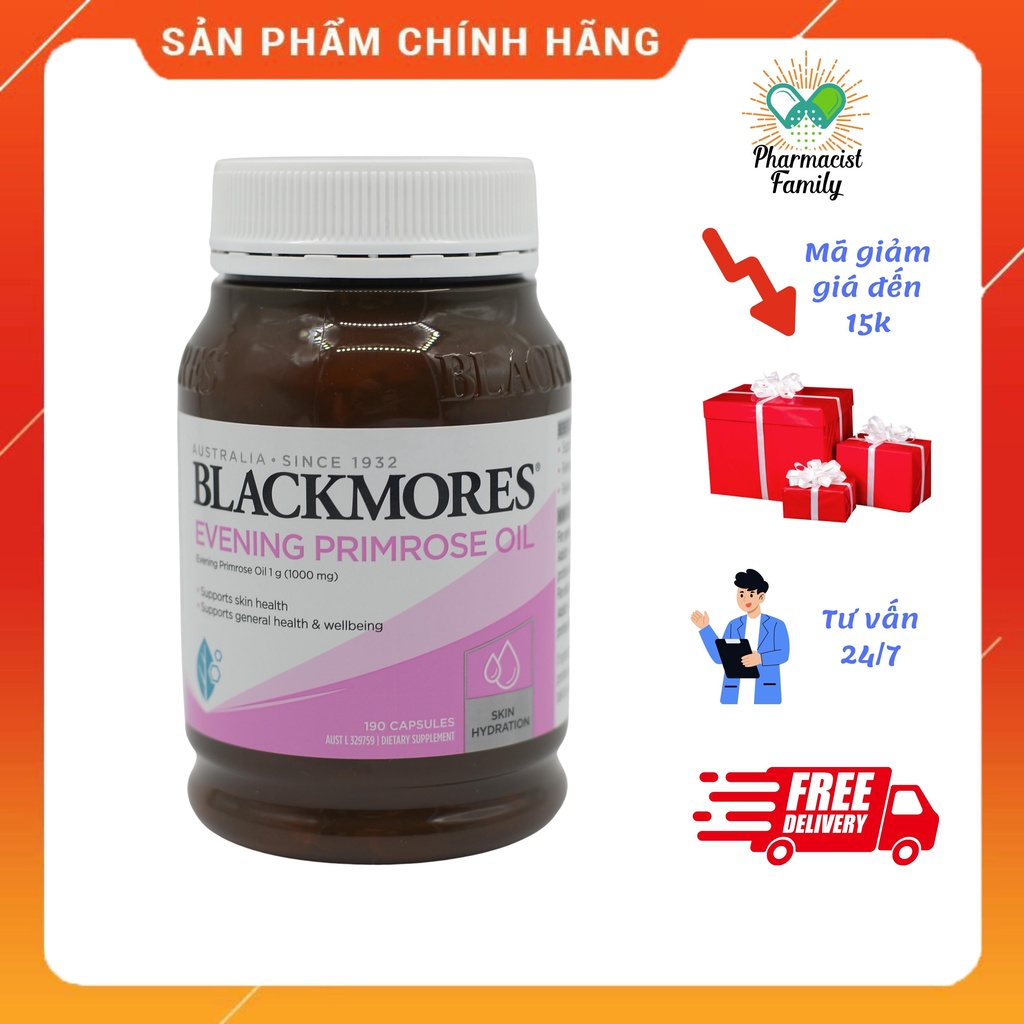 Cảm ơn bạn đã quan tâm đến sản phẩm của Pharmacist family. Chúng tôi luôn quan tâm hàng đầu đến sức khỏe của bạn. Mọi người cân tư vấn vui lòng liên hệ qua Zalo: 0983374473 -------------------------------------------------------------------------------- Công dụng của Tinh dầu hoa anh thảo Blackmores Evening Primrose oil: - Cân bằng nội tiết ---------------------------------------------------------------------- Tinh dầu hoa anh thảo Blackmores Evening Primrose oil thành phần chính của là GLA (acid gamma-linolenic), một loại axit béo thiết yếu. ------------------------------------------------------------------------------------------------------------- HƯỚNG DẪN SỬ DỤNG - Người lớn : 3 viên/ngày. 1 viên/lần, uống sau khi ăn. - Trẻ em 6-12 tuổi: 1-2 viên/ngày, 1 viên/lần - Trẻ em 2-6 tuổi: 1 viên/ngày, trộn với sữa, thức ăn hoặc nước hoa quả. Lọ 190 viên. Sản phẩm này không phải là thuốc và không có tác dụng thay thế thuốc chữa bệnh #blackmores #Blackmores_Evening_Primrose #tinh_dầu #tinh_dầu_hoa_anh_thảo #hoa_anh_thảo #omega #omega_6 #trẻ_hóa #cân_bằng