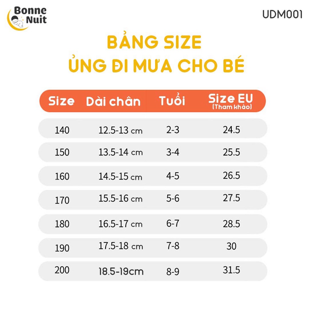 ✅ ỦNG ĐI MƯA: ⭐️ Chất liệu: Nhựa EVA siêu nhẹ, siêu mềm, siêu dẻo giúp bé đi lại thoải mái, chống trơn trượt, an toàn tuyệt đối trong trời mưa. ⭐️ Giày nhẹ cân và mang không bị gò bó, có phần dây rút, có thể điều chỉnh cho phù hợp với chân bé. ⭐️ Phần mũi giày có thiết kế hình gấu nổi vô cùng đáng yêu, làm điểm nhấn thêm cho đôi giày của bé. ⭐️ Bảng size: Full size cho bé chân từ 12.5cm - 18cm