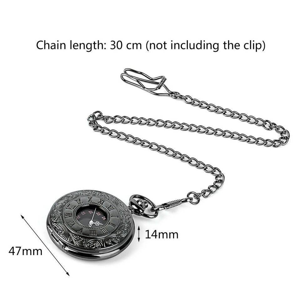 Đặc điểm: Đồng hồ bỏ túi cổ điển và chất lượng cao thời trang. Vỏ đồng hồ là hợp kim tông màu đen bạc. Con trỏ rỗng với màn hình số La Mã. Thiết kế thời trang với chuyển động thạch anh chính xác. Hoàn hảo như một món quà cho bạn bè của bạn.