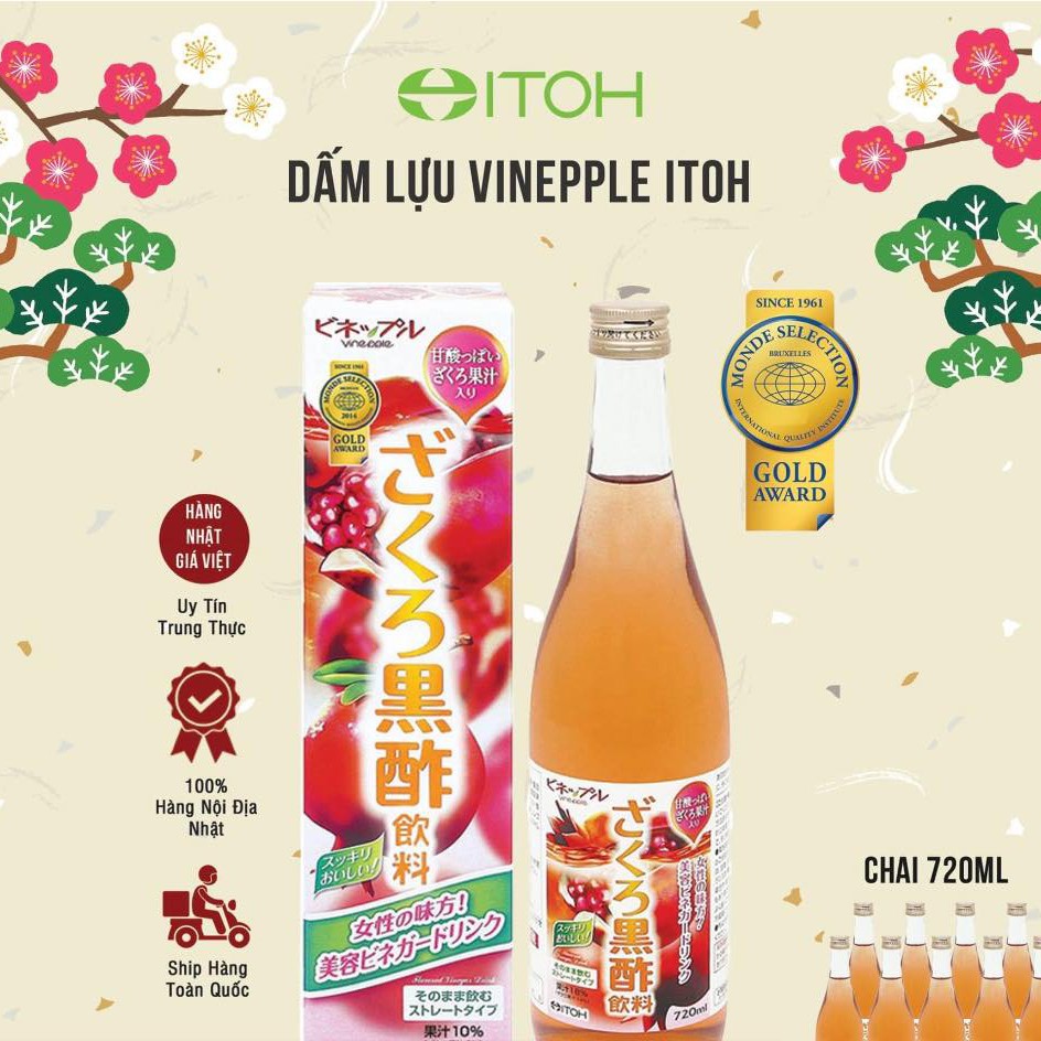 Thông số sản phẩm Xuất xứ: Nhật Bản Thành phần: Dấm gạo lên men, nước ép quả lựu, nước ép táo, mật ong, siro nho fructoza, axit citric Quy cách đóng gói: Chai 720 (ml) Hạn sử dụng: 2 năm kể từ ngày sản xuất Công dụng nổi bật của Nước uống ITOH Vinepple dấm lựu: Hỗ trợ bổ sung nhiều vitamin và khoáng chất tăng cường sức khỏe Hỗ trợ giảm mỡ máu, giảm béo, Hỗ trợ thanh lọc, giúp cơ thể cân đối, khoẻ mạnh Hỗ trợ tiêu hoá, tăng cường sức khoẻ, làm đẹp da, tốt cho tim mạch Hướng dẫn sử dụng và bảo quản: Uống 100ml/ngày Có thể pha với nước hoặc các đồ uống khác Bảo quản nơi khô ráo, thoáng mát, tránh ánh nắng trực tiếp và nhiệt độ cao Sau khi mở nắp, phải bảo quản lạnh Không sử dụng cho trẻ dưới 1 tuổi Để xa tầm tay trẻ em Sản phẩm này không phải là thuốc và không có tác dụng thay thế thuốc chữa bệnh. Nhập khẩu và phân phối: Công ty TNHH Phát Việt Địa chỉ: 441 Kim Mã, Ngọc Khánh, Ba Đình, Hà Nội