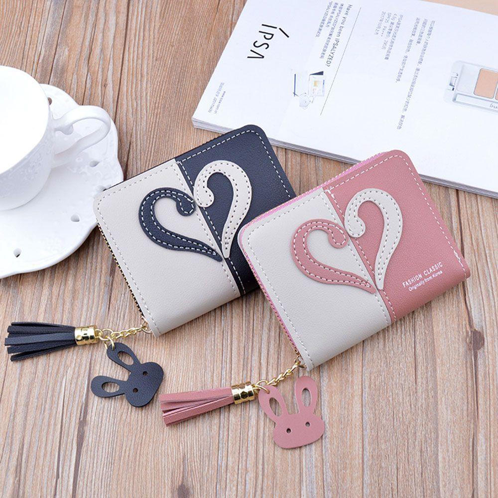 Ví nữ Ví tiền xu Ví nhỏ Chủ thẻ tín dụng Ví da Pu có dây kéo và tua màu tương phản Màu thời trang Hàn Quốc Phiên bản trái tim Mới