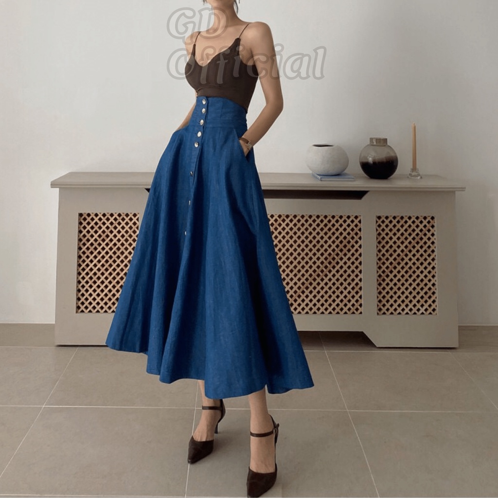 Giới thiệu V3|Váy denim hàng cúc xòe lớn dáng dài cho nữ thanh lịch, công sở nhẹ nhàng màu xanh GD Official
