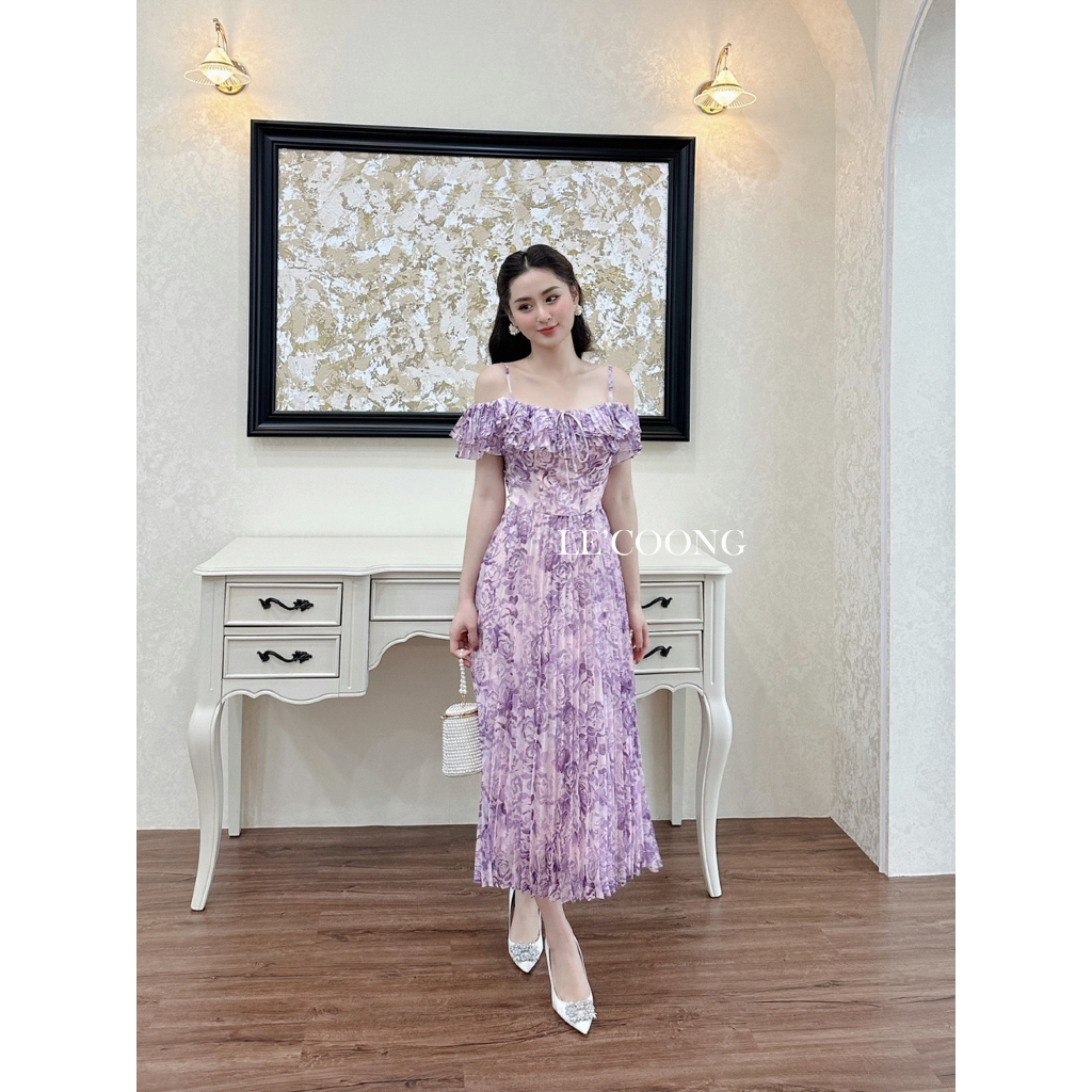 Giới thiệu Váy Đi Biển Dáng Dài LECOONG V353 Đầm Maxi Trễ Vai Xếp Ly Họa Tiết Hoa Hồng Chất Voan Tơ Mềm Tiểu Thư
