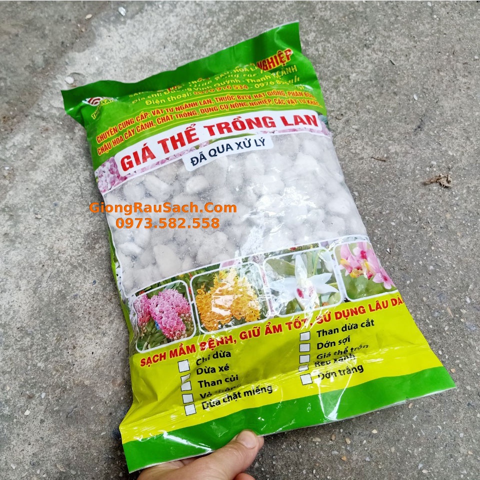Vỏ thông đã qua xử lý từng size tương ứng giai đoạn phát triển cây 1kg/gói Xơ dừa sợi đã xử lý giữ ẩm cho giá thế lan 200gr/bói Rêu đã được xử lý trồng giữ ẩm tốt cho cây 200gr/gói Rớn sợi đã được xử lý giữ ẩm tốt cho lan 200gr/gói Bọt biển indo đã xử lý thích hợp trồng cây 1kg/gói