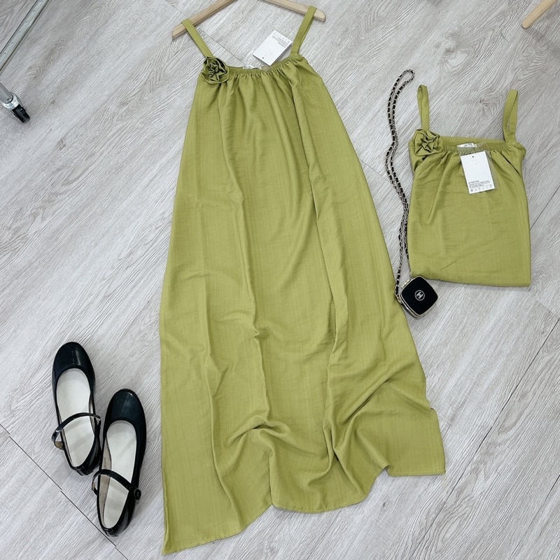 Giới thiệu Váy 2 dây chất đũi tơ màu xanh chuối xoè chữ A Đầm suông 2s hở vai dáng dài váy maxi xanh bơ