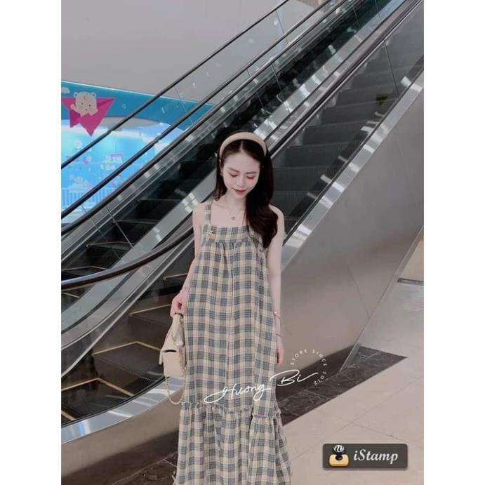 Giới thiệu Váy bầu kẻ cổ vuông 2 dây Xuân hè .đầm bầu đuôi cá kẻ caro mềm mát