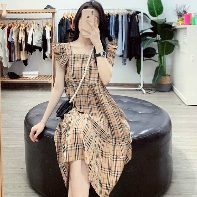 Giới thiệu Váy bầu kẻ sọc caro Đầm cổ vuông tay cánh tiên chất thô đẹp sang chảnh