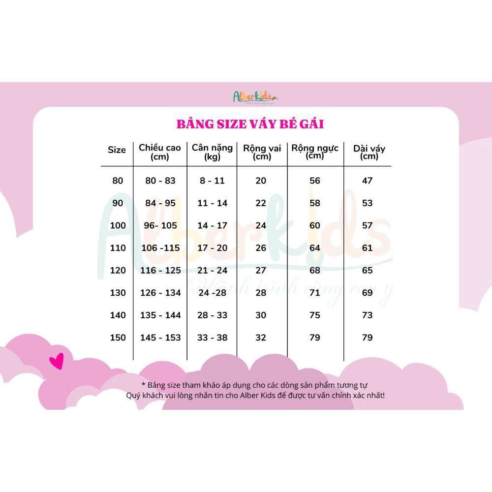 👉 Hướng dẫn chọn size cho bé : ✔️Với những bé có thân hình mảnh dẻ ba mẹ chọn size theo thông số. Còn với những bé mũm mĩm, ba mẹ chọn cho con theo cân nặng ✔️ Để chọn lựa chính xác, ba mẹ có thể nhắn tin cho Alber Kids để nhận tư vấn nhé. Bảng size cho bé size 90 ( 11kg-14kg, cao 90-95cm) size 100 ( 14kg- 17kg, cao 95-105cm) size 110(17kg-20kg, cao 106-115cm) size 120(20kg-24kg, cao 116-124cm) size 130 (24kg-28kg, cao 125-134cm) size 140 (28kg-32kg, cao 135-144cm) size 150 (32kg-36kg, cao 144-153cm) size 160 (36kg-40kg, cao 153-160cm)