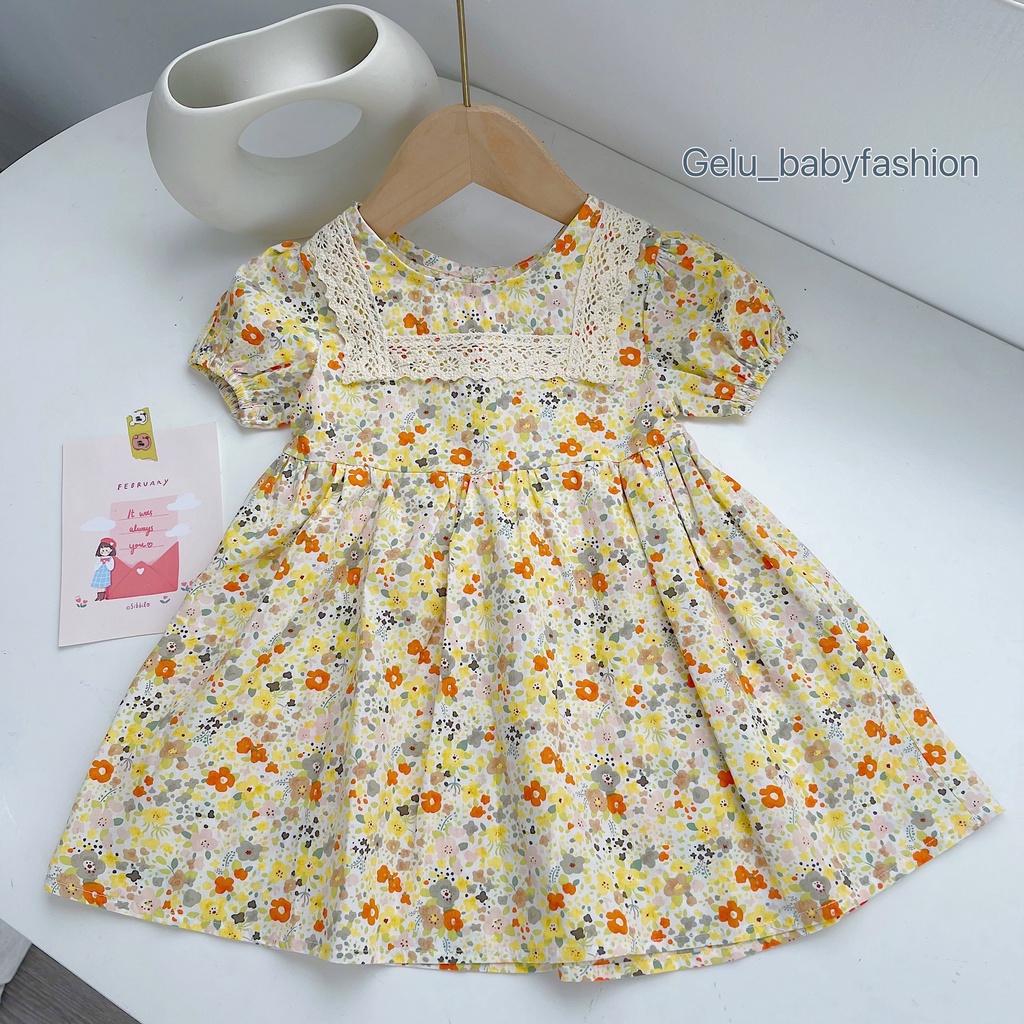 Váy bé gái Gelukids họa tiết hoa nhí cổ yếm ren THÔNG TIN SẢN PHẨM ☑️ Xuất xứ: Việt Nam ☑️ Chất liệu: thô cotton ☑️ Màu sắc:vàng, xanh ☑️ Size: 9-30 kg)