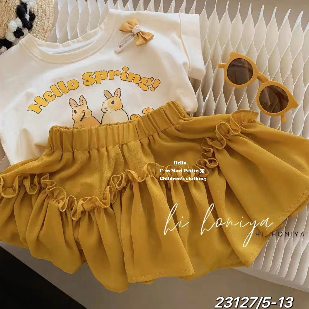 Giới thiệu Váy bé gái, set áo cotton thỏ vàng HELLO SPRING kèm chân váy bèo tầng siêu xinh cho bé
