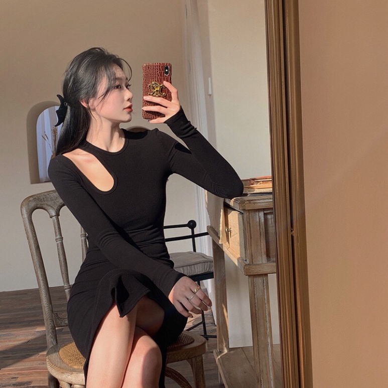 Giới thiệu Váy body nữ cổ tròn khoét vai quyến rũ mặc tôn dáng,Váy dài tay mặc thu đông 2 màu trẻ trung cá tính