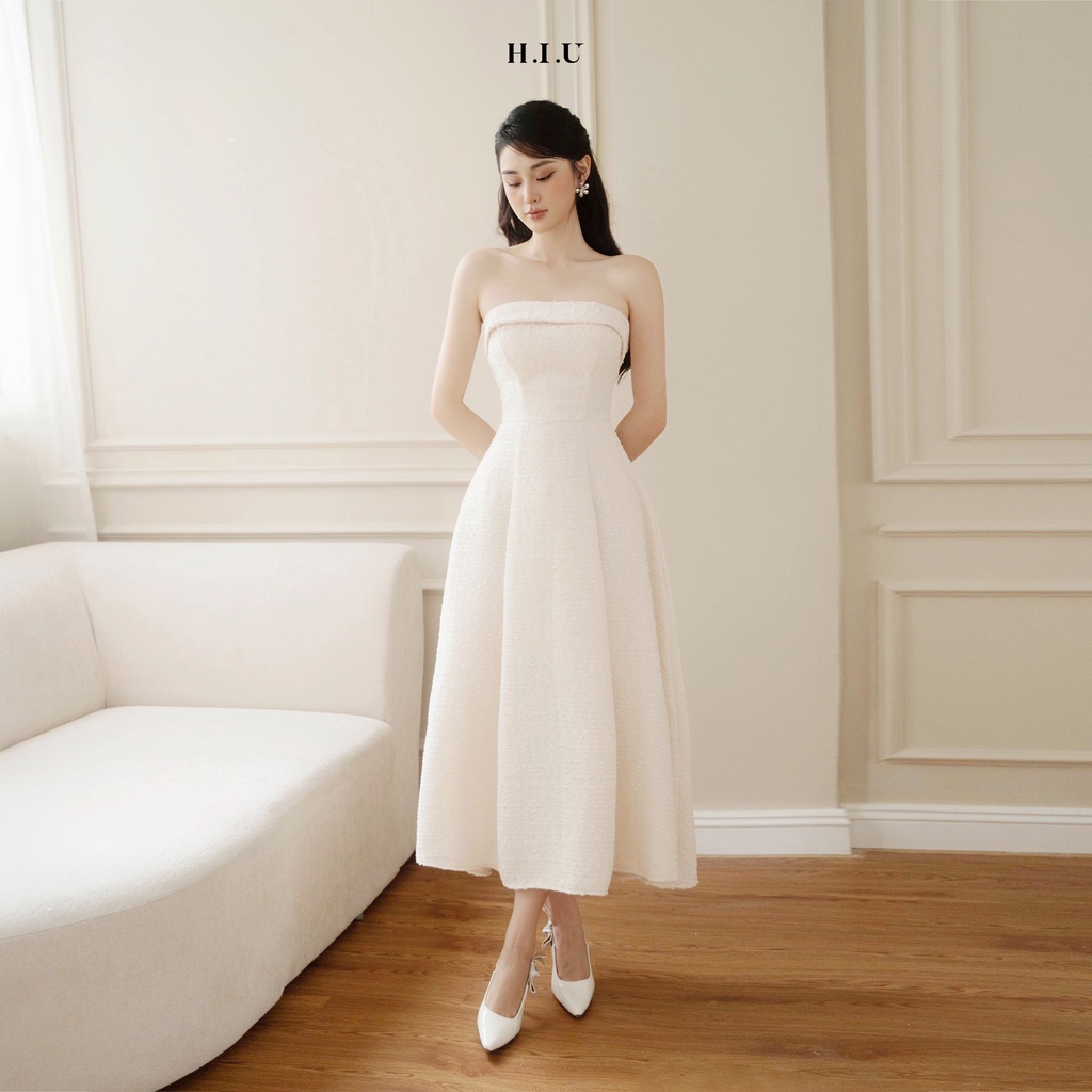 Giới thiệu Váy cup ngực nữ dạ tweed trắng kem vân nổi dáng Dài JUNA dress H.I.U Fashion , ko nhàu, vải có độ dãn vừa phải co dãn