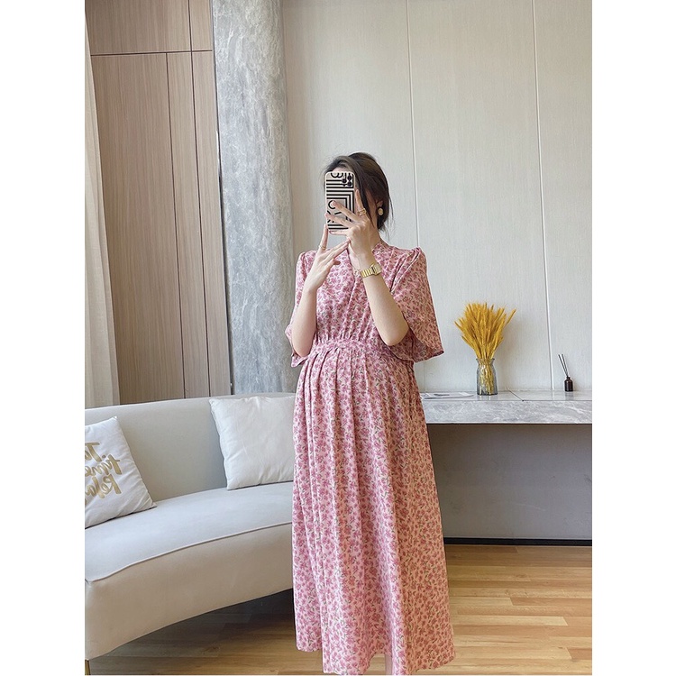 Váy đầm bầu hoa nhí hồng cổ v thiết kế công sở, dự tiệc cho mẹ bầu phong cách hàn quốc sang trọng lịch sự mới mùa hè